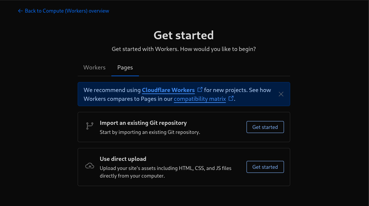 After clicking that, you will be shown the page for Cloudflare Workers and Pages. Select the "Pages" tab, then "Use direct upload". You can also use direct Git integration if you so wish.